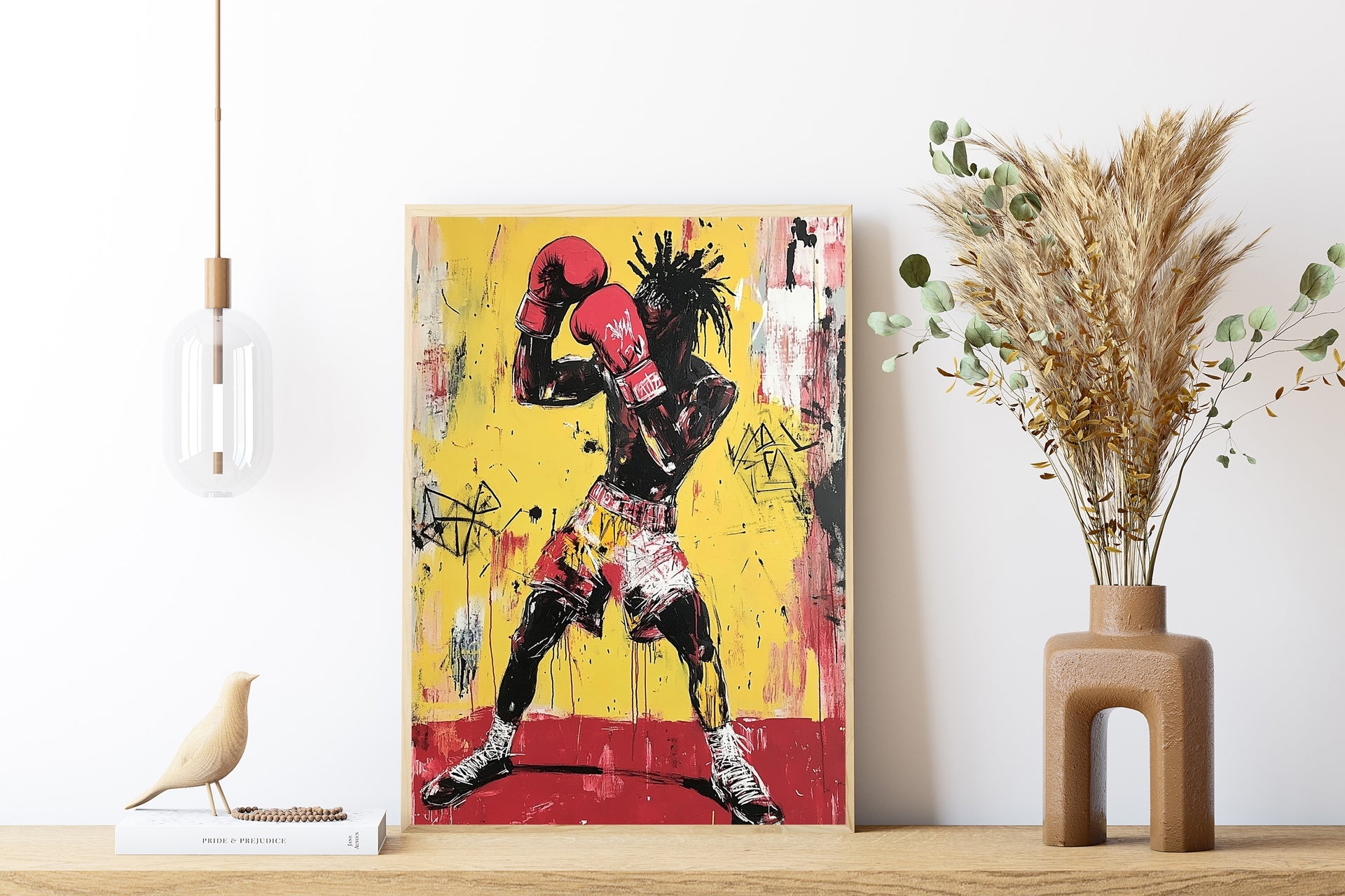Bloodlines & Baselines is a fierce tribute to the raw poetry of boxing and the spirit of resistance, inspired by the iconic style of Jean-Michel Basquiat. Bold lines, fragmented anatomy, and chaotic scribbles collide with symbols of power, struggle, and legacy. A crowned fighter stands center stage—gloves raised, eyes defiant—surrounded by cryptic words and punch-drunk rhythm. This piece captures the brutal beauty of the ring, echoing the fight in the streets and in the soul. Perfect for those who see art as both a battle cry and a celebration of survival.