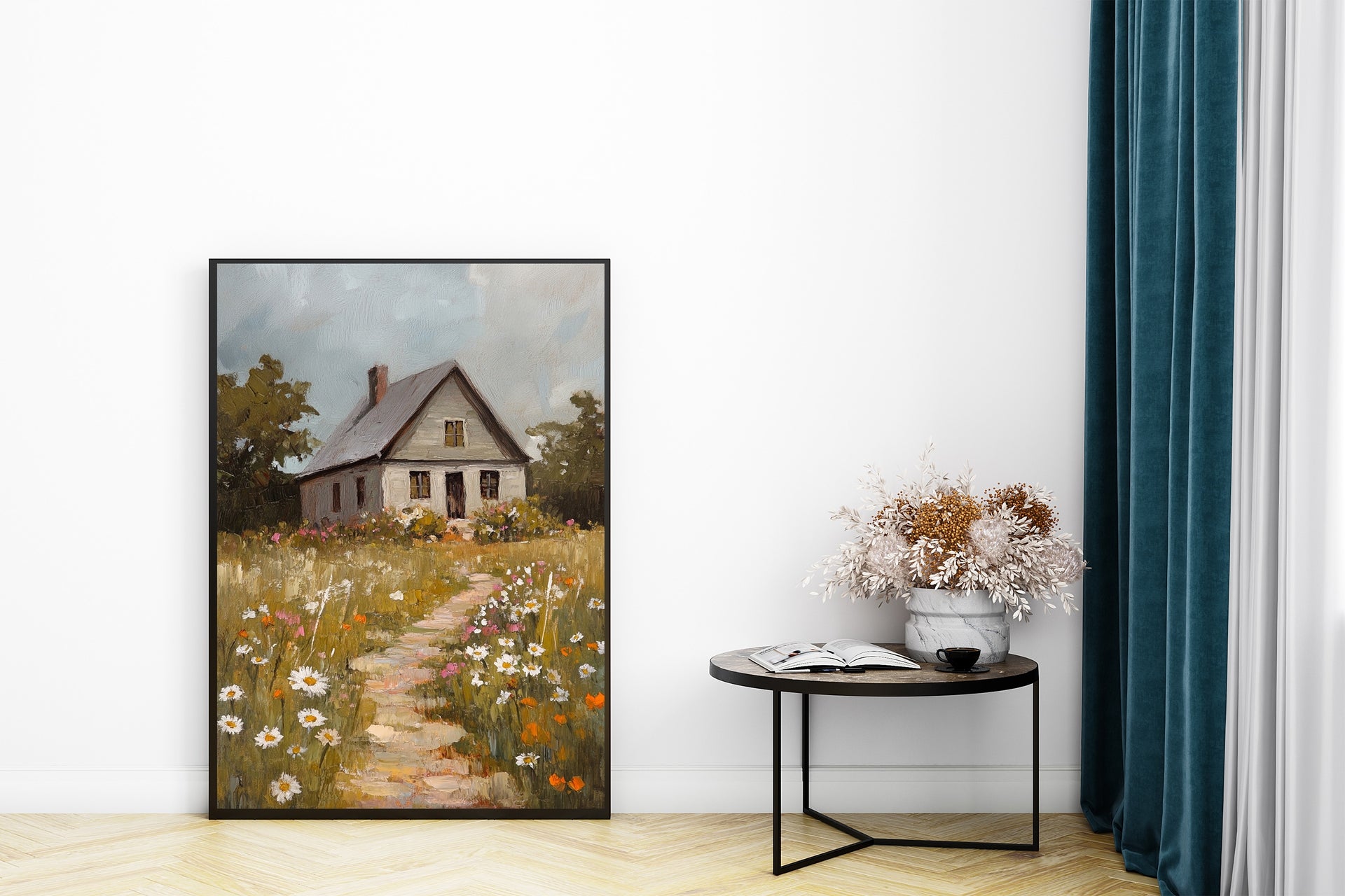 Blooming Path to the Farmhouse – Rustic Cabin & Wildflower Wall Art