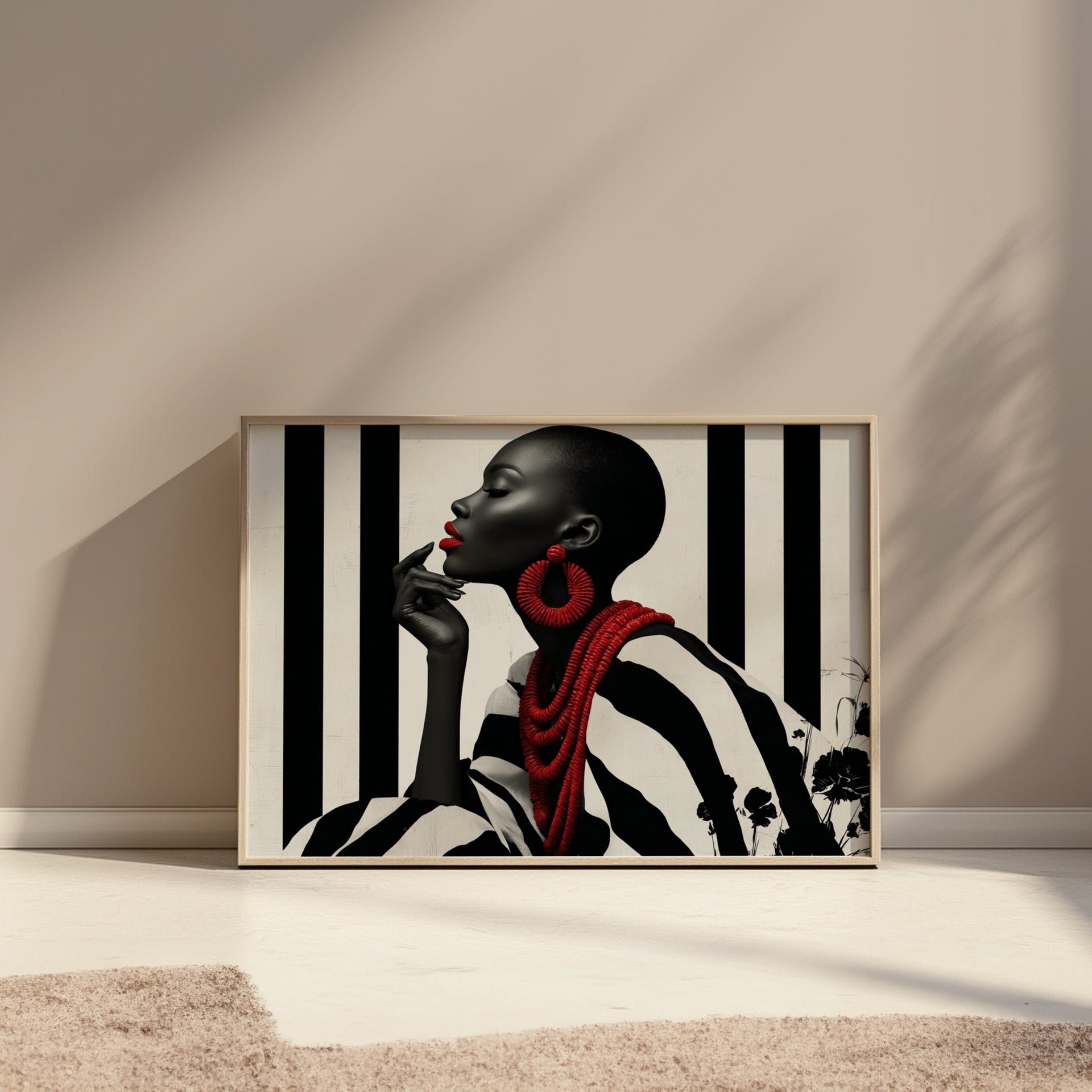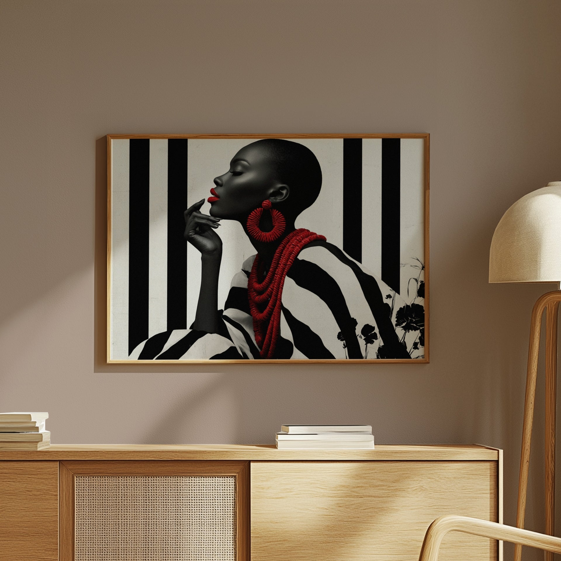 Make a statement with "Bold Beauty – African Chic Wall Art," a captivating portrait of a stylish African woman radiating elegance, confidence, and cultural pride. With rich detail and fashionable flair, this piece blends modern aesthetics with traditional roots. Ideal for bedrooms, offices, or gallery walls, this print comes printed or unframed/framed, offering timeless sophistication for any space.