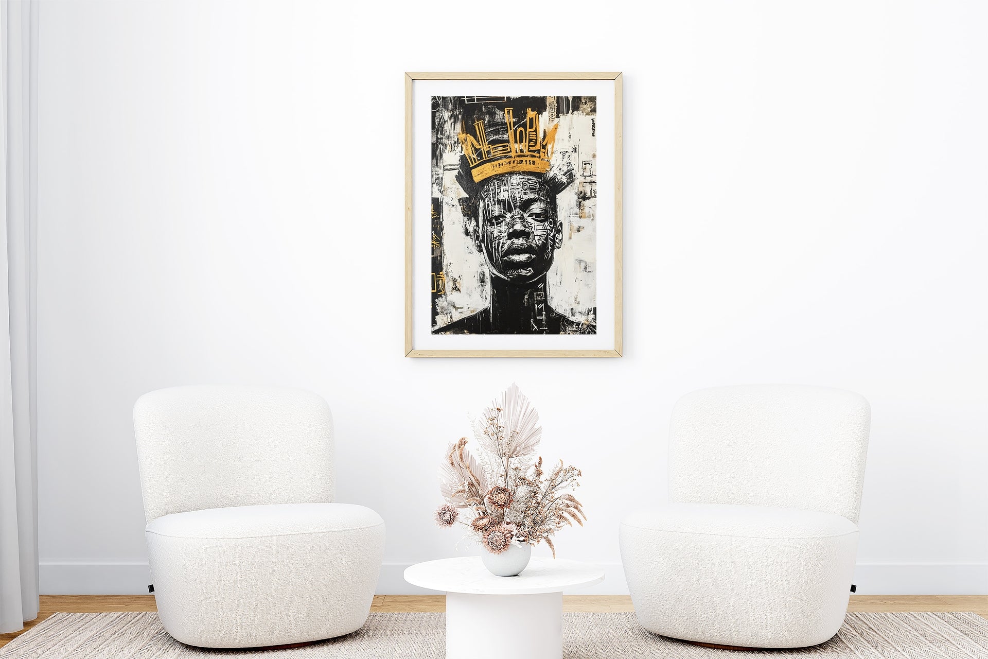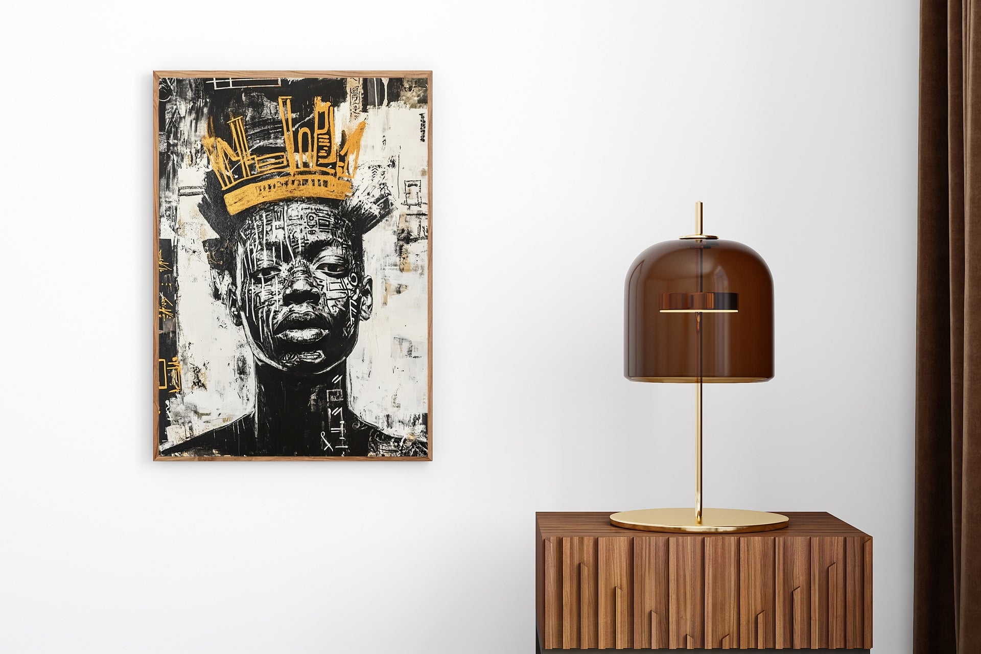 Broken Crown Wall Art captures the spirit of Jean-Michel Basquiat with a striking portrait of a Black male wearing a fractured golden crown. Raw lines, vivid colors, and street-style chaos merge to reflect themes of identity, struggle, royalty, and resilience. This bold piece confronts history and celebrates power in imperfection—perfect for contemporary, urban, and expressive interiors.