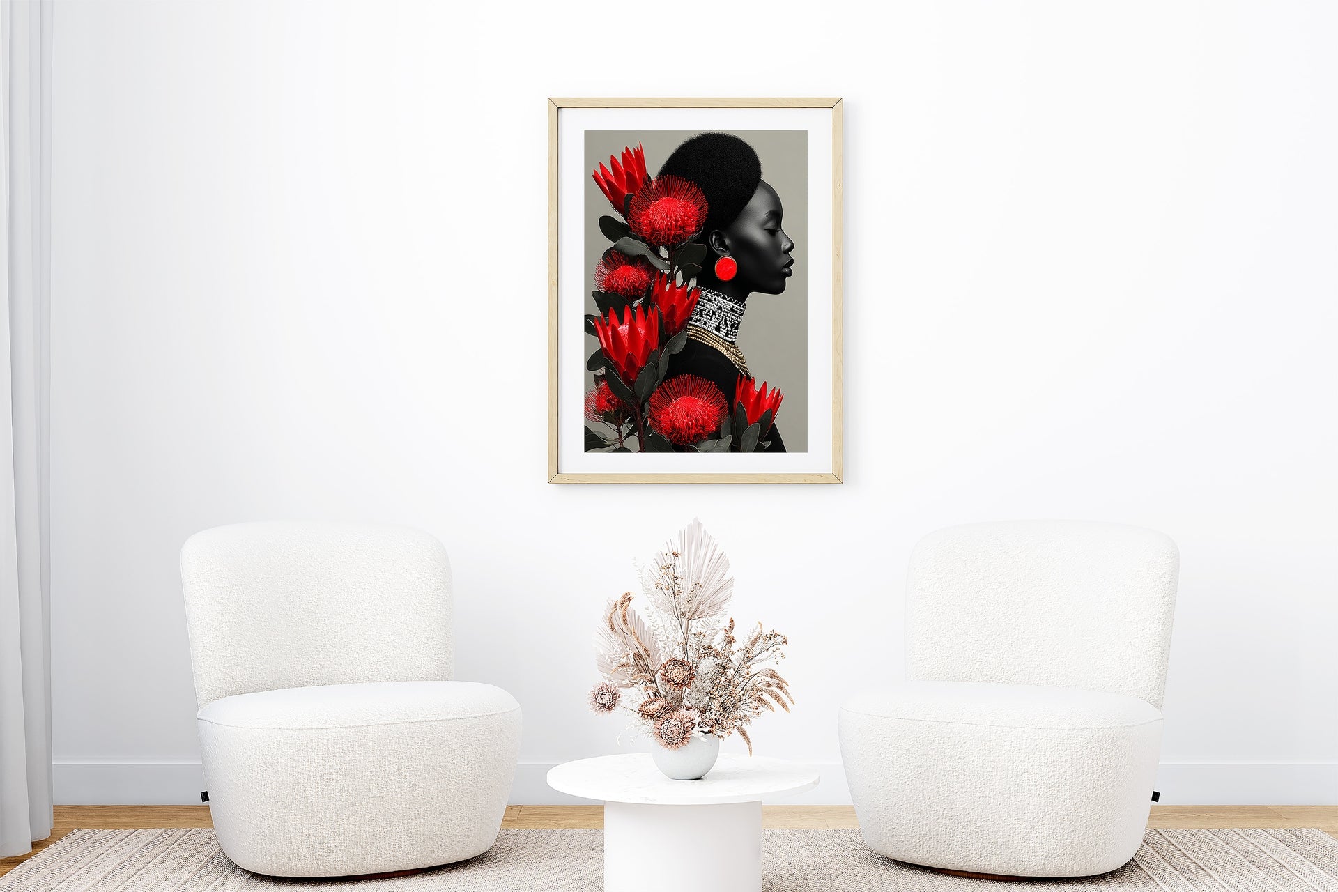 A stunning collection of high-fashion African wall art inspired by Vogue-style covers. Featuring radiant African women in majestic traditional attire, from golden hour deserts to floral elegance and tribal grace. Each piece captures culture, beauty, and boldness in luxurious editorial lighting — perfect for modern interiors that celebrate heritage and style.
