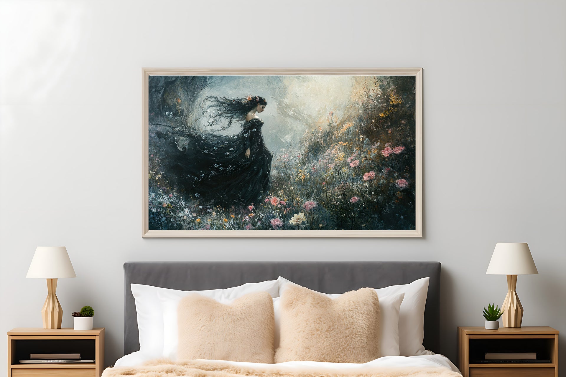 This beautiful painting portrays Persephone, the queen of the underworld, in a unique blend of dark underworld elements and blooming spring flowers. The artwork captures the essence of duality and transformation, with soft, natural colors and painterly brushstrokes that evoke a sense of balance and renewal. Perfect for those who appreciate serene landscapes and classical mythology, this piece brings a touch of depth and elegance to your home decor.