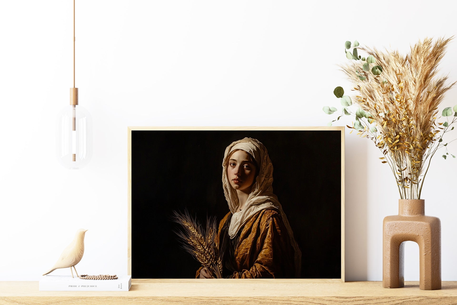 This Baroque-style artwork showcases Ruth, a revered Bible character known for her loyalty and steadfast love. The rich, dramatic details and classical composition bring Ruth’s story to life, highlighting her faith and devotion. This elegant depiction of Ruth is perfect for those seeking to add timeless, biblical inspiration to their space.